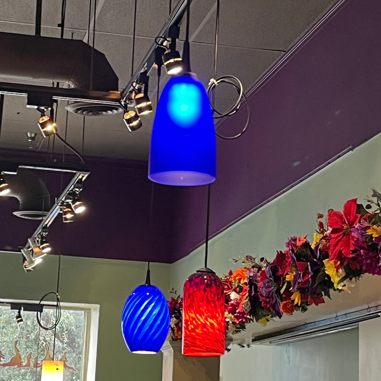 We have three pendants from Glasslight Studio available at an incredible discounted price of $150/each with Track adapter or Canopy hardware available for each pendant.