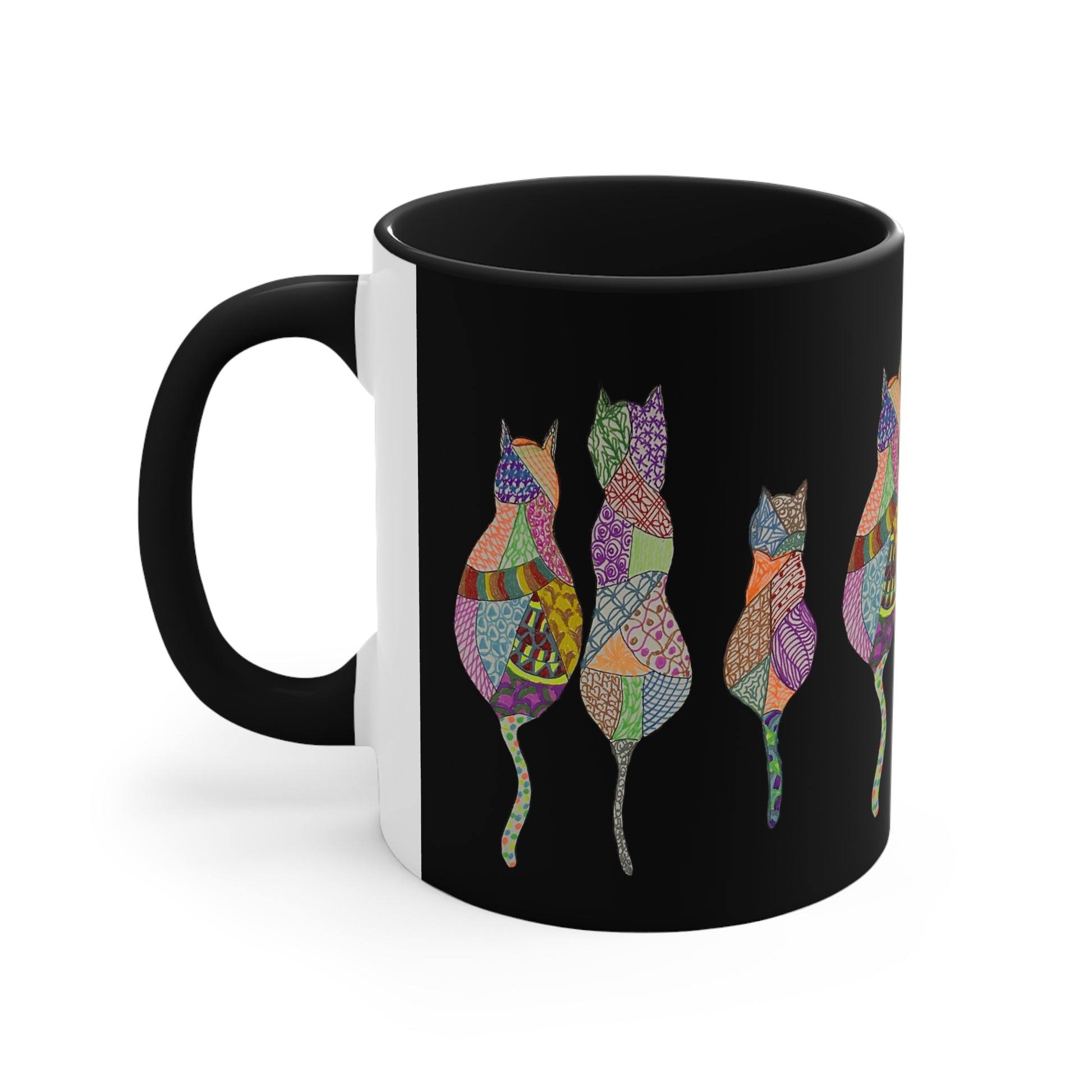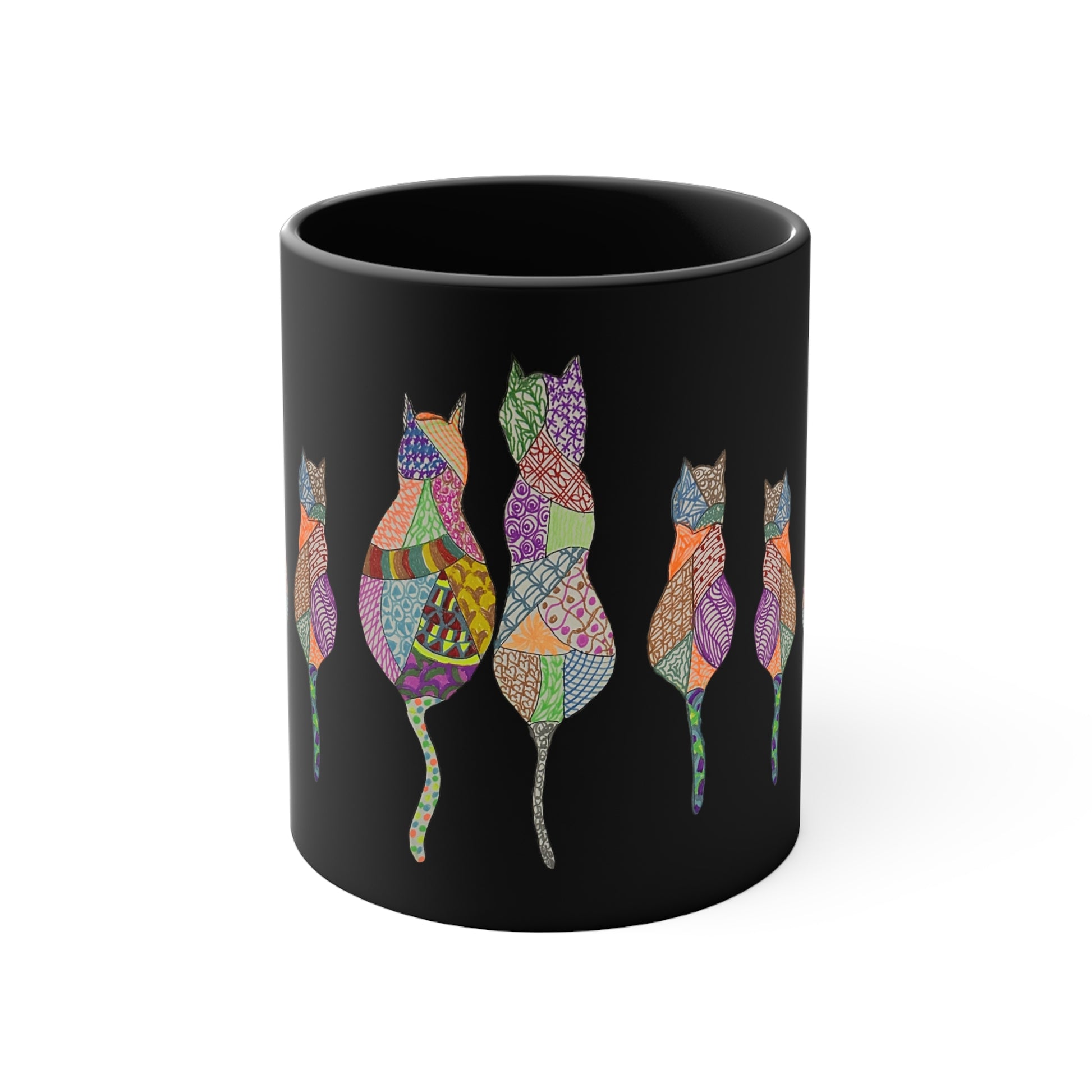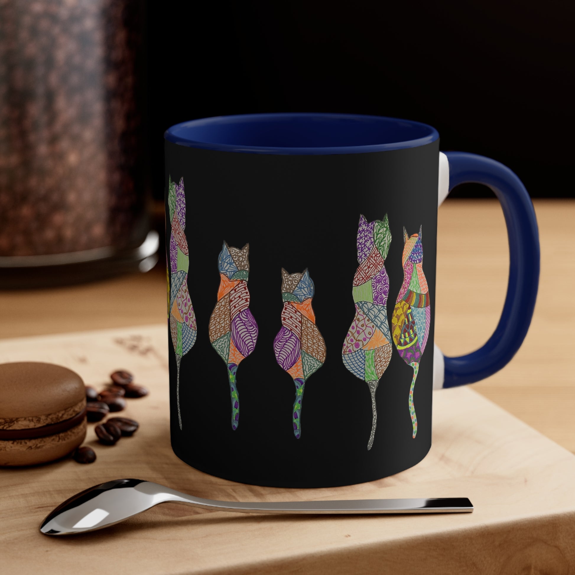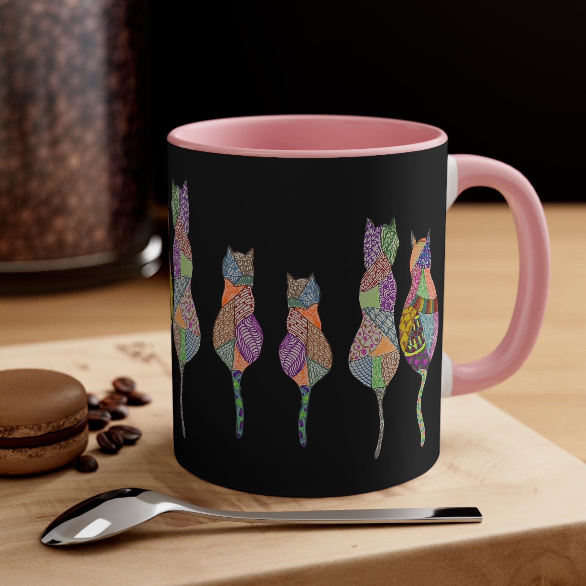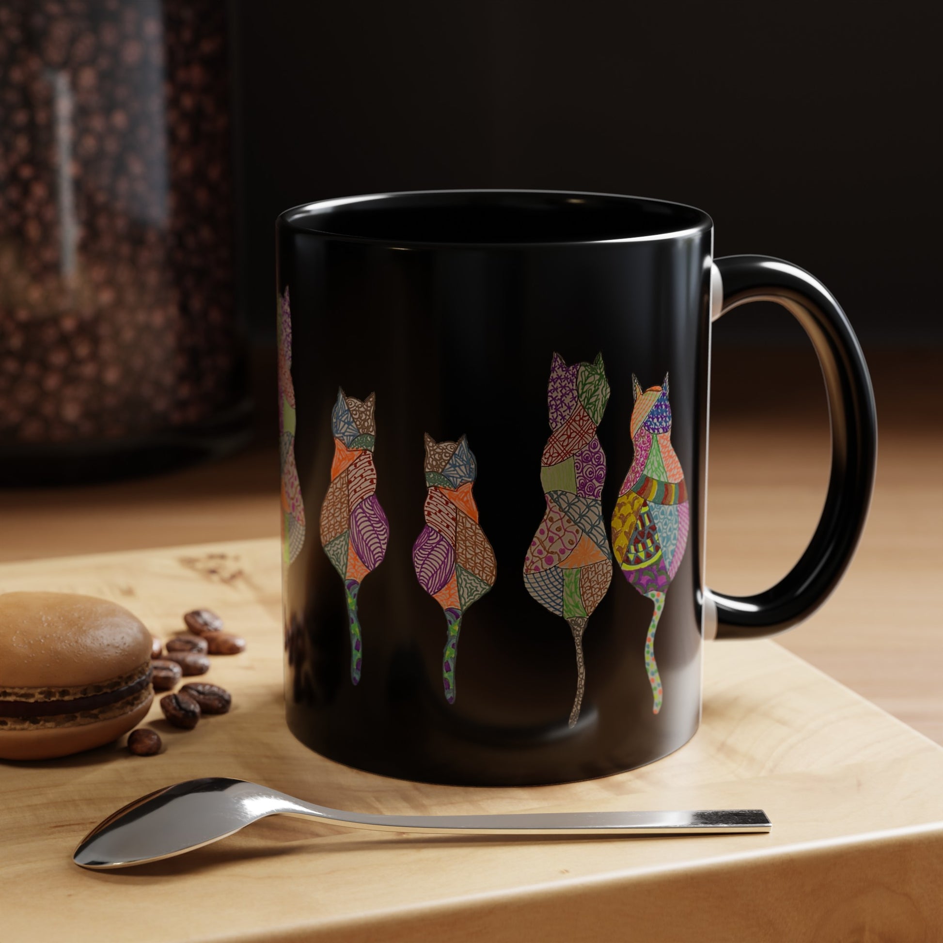 This hand drawn design features a kaleidoscope of colors representing the many diverse personalities of cats. Like us, sometimes they just need some coffee.