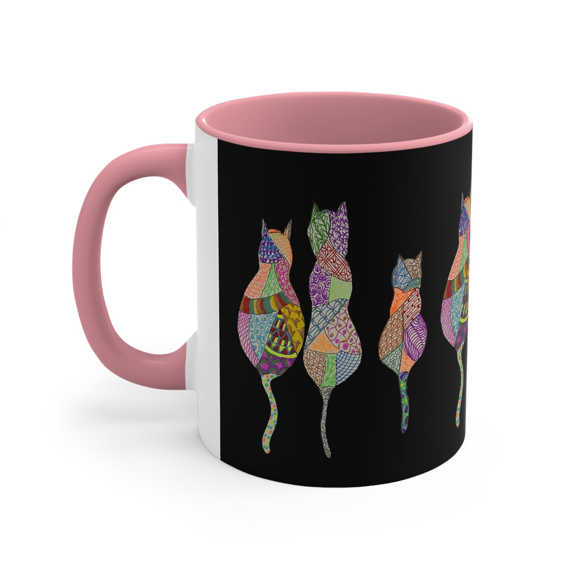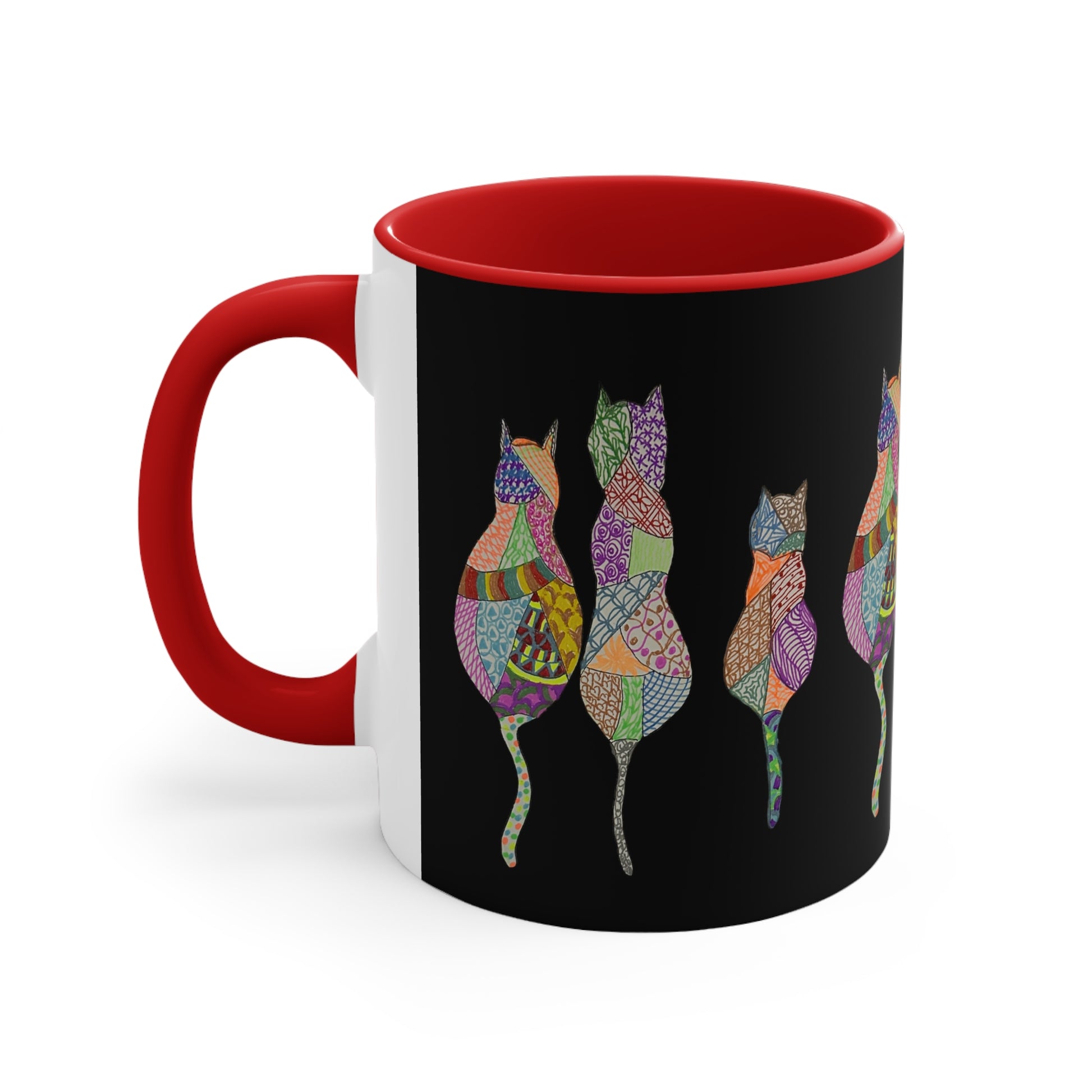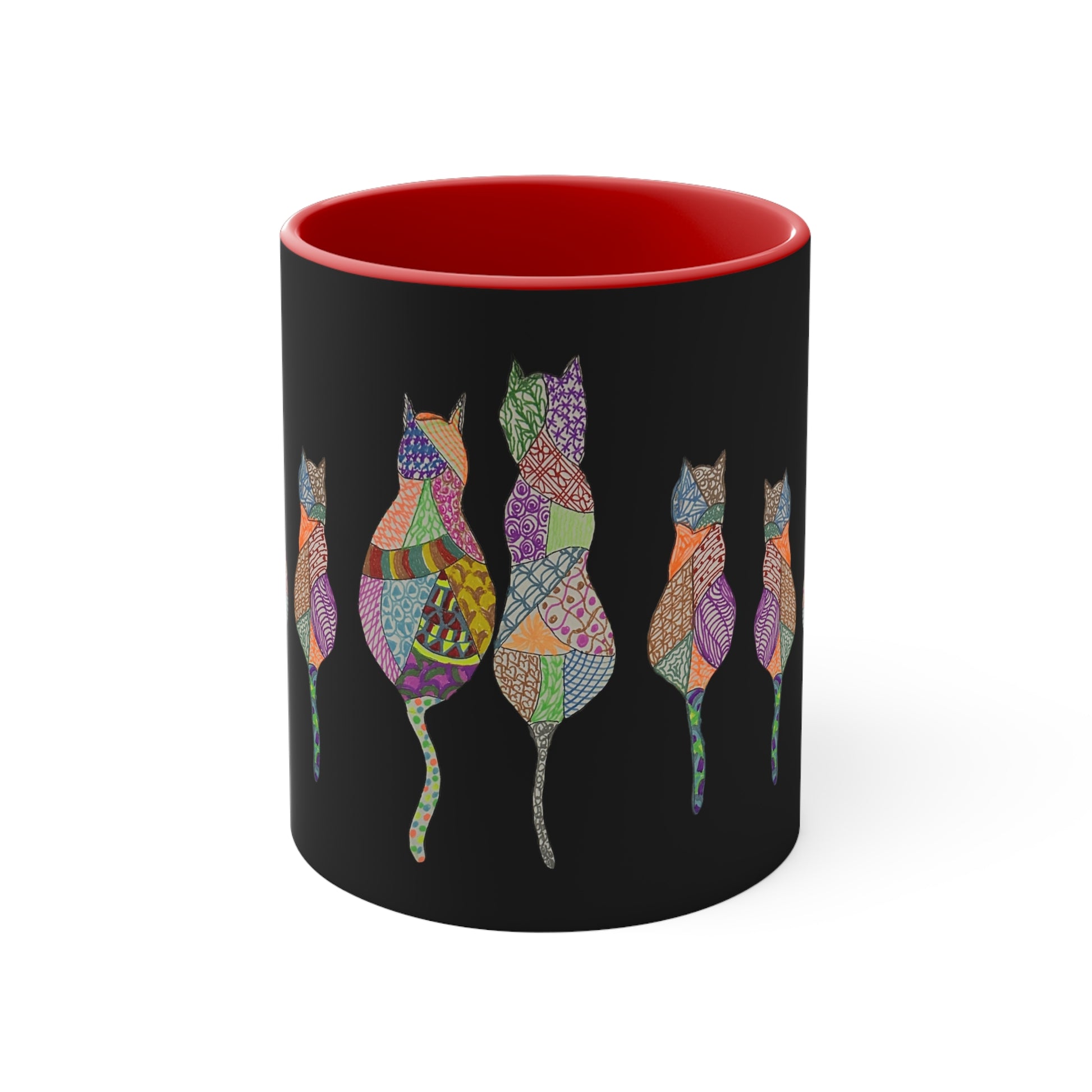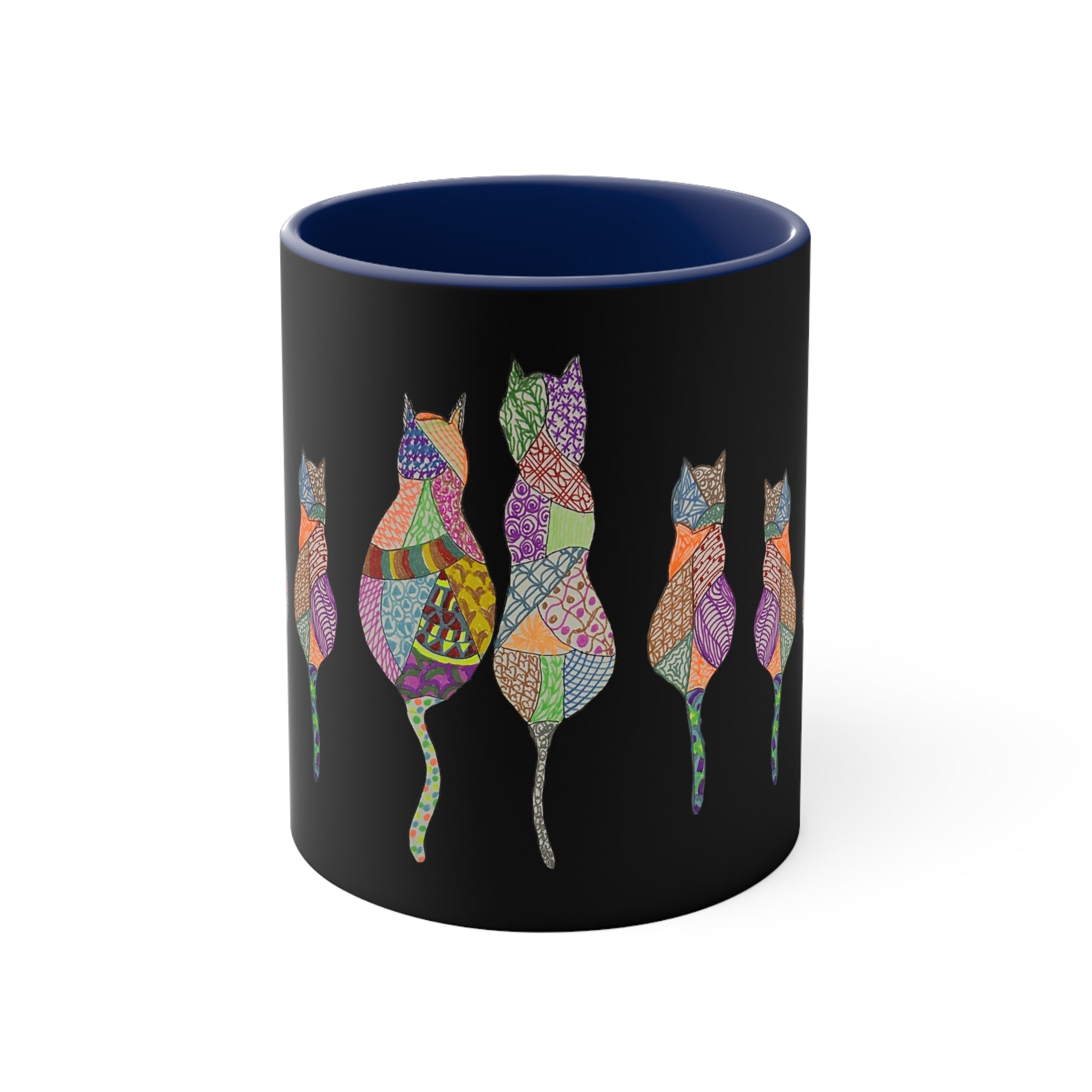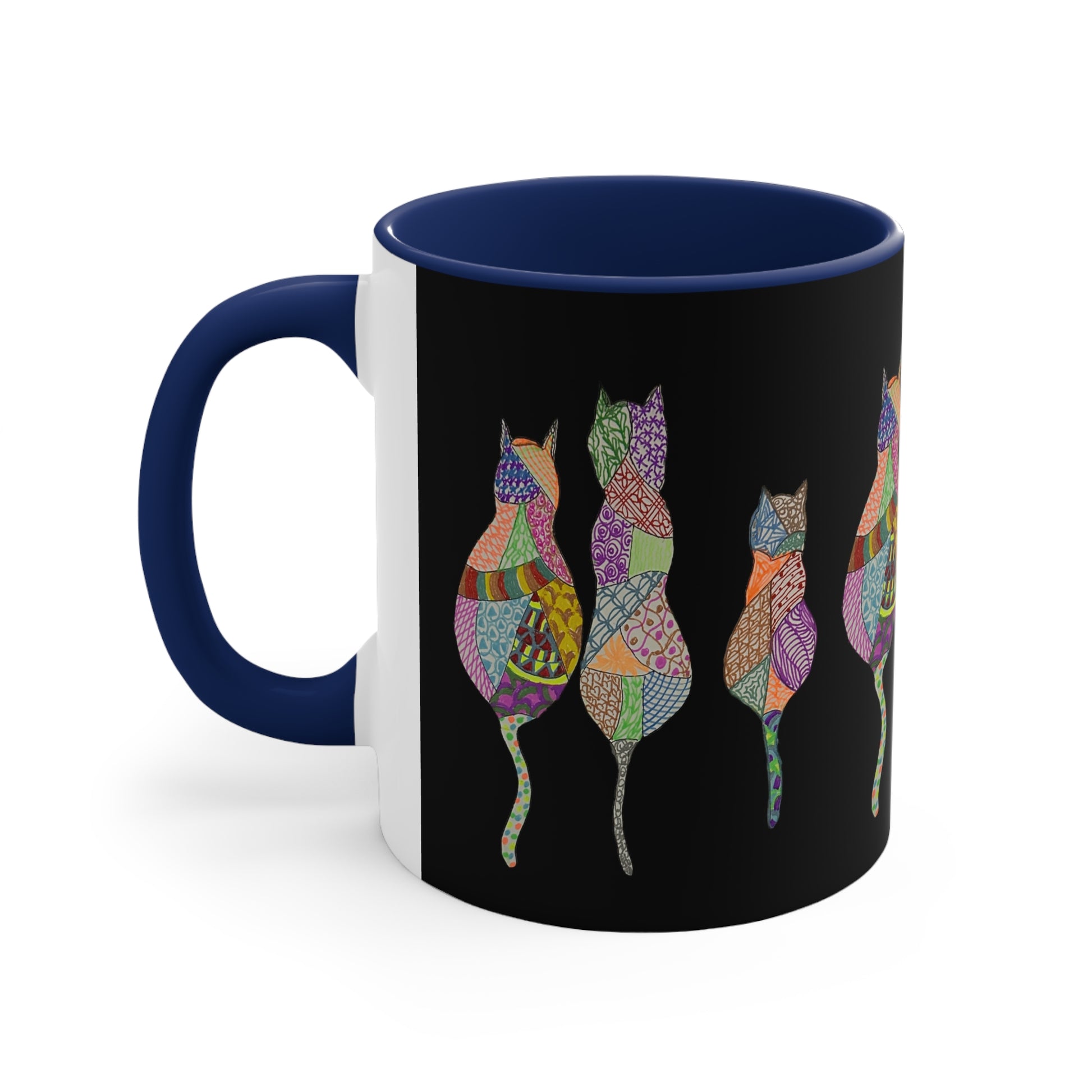 This hand drawn design features a kaleidoscope of colors representing the many diverse personalities of cats. Like us, sometimes they just need some coffee.