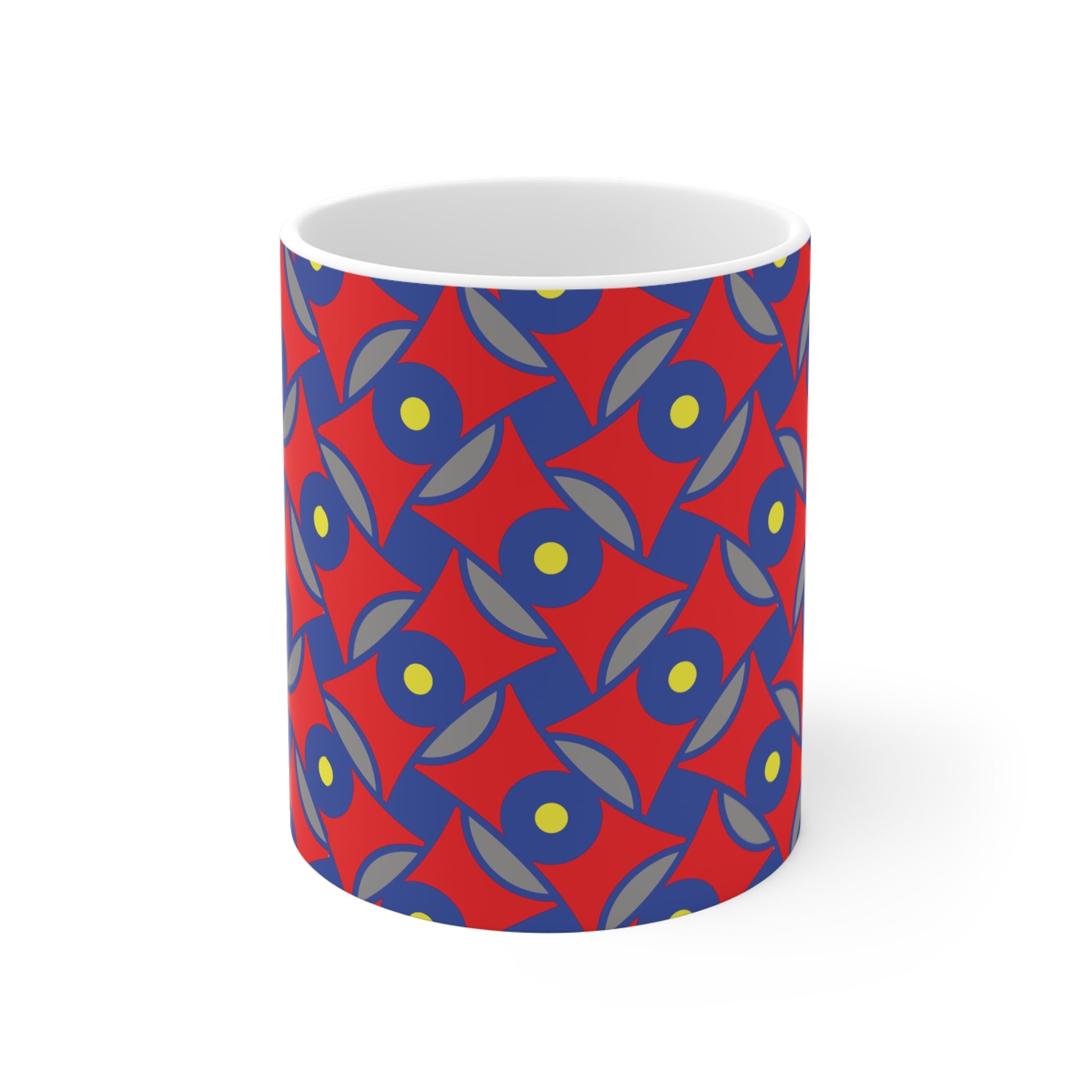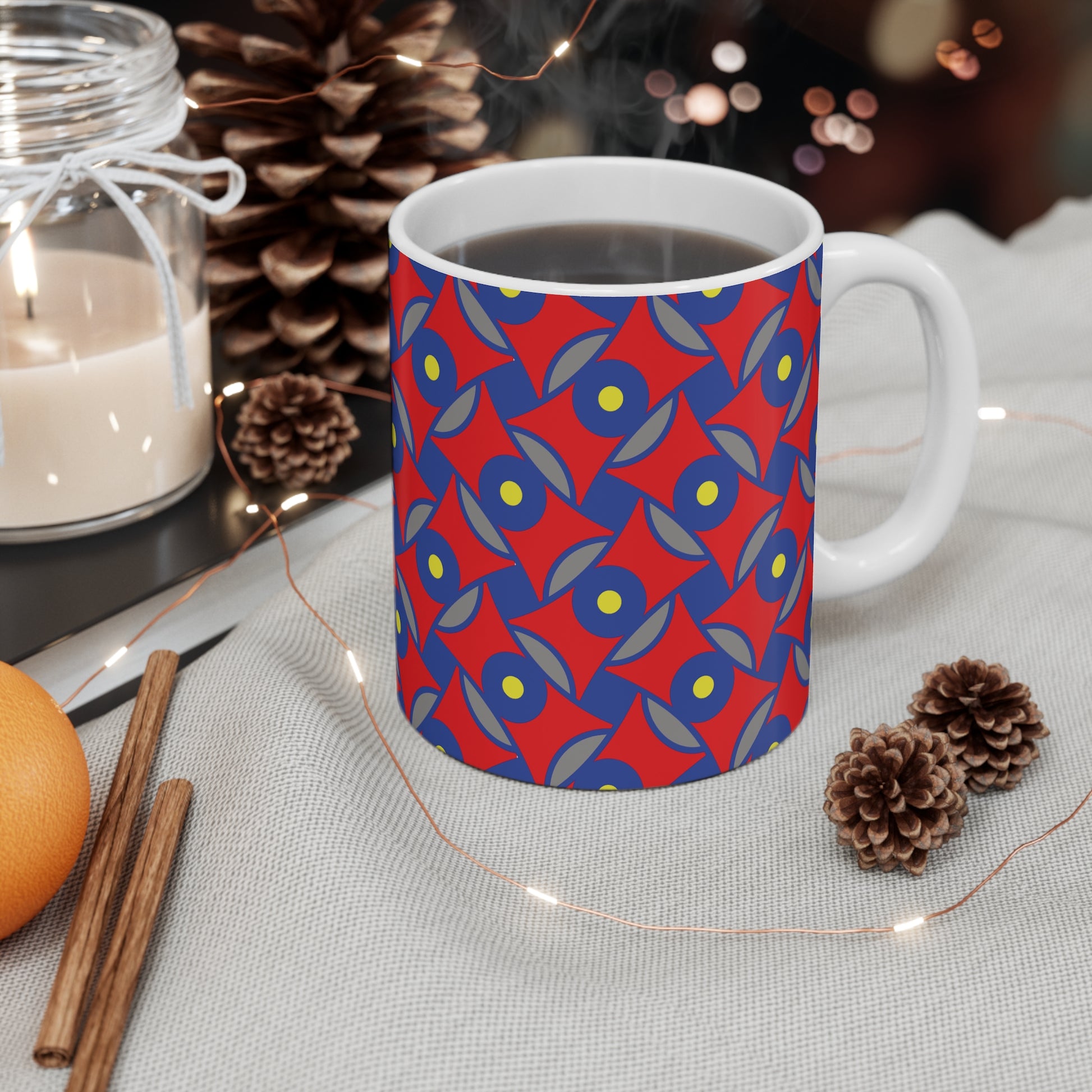 11 oz. ceramic mug with comfortable C-shaped handle. Mug is lead and BPA-free. Microwave and dishwasher safe.