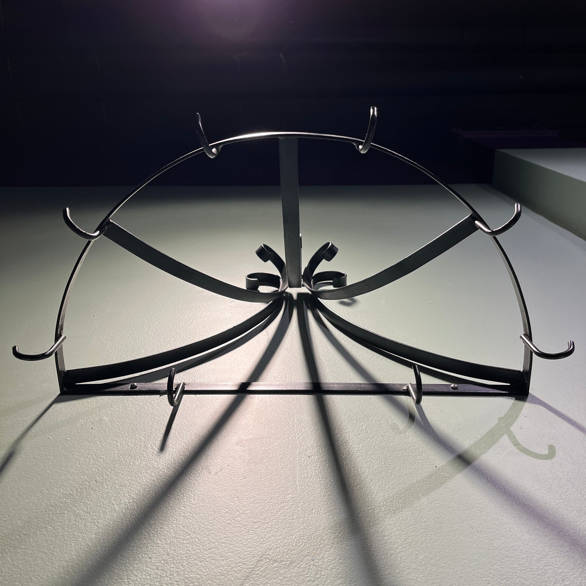 Custom vintage wrought iron pot rack. This was designed and created for a local Savannahian in the 1960's. A sturdy rack with 8 hooks for holding pots and pans or can be used with cloth as a canopy over a bed or for displays. We used it to display ornaments in the gallery. It is a custom one of a kind piece. Convenient shape makes it easy to hold or display several different items.