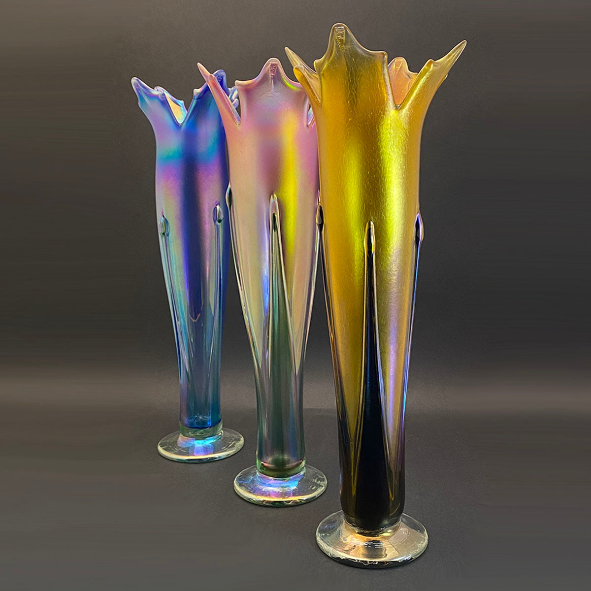 Enhance your home with a vibrant touch of color and shine using these handblown vases. Their unique sculptural design with petal tops adds a touch of elegance at an affordable price, making them the perfect way to make a lasting décor statement.
