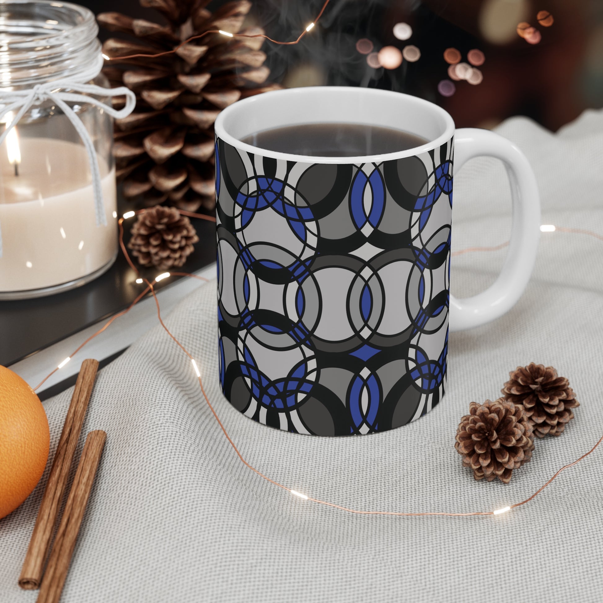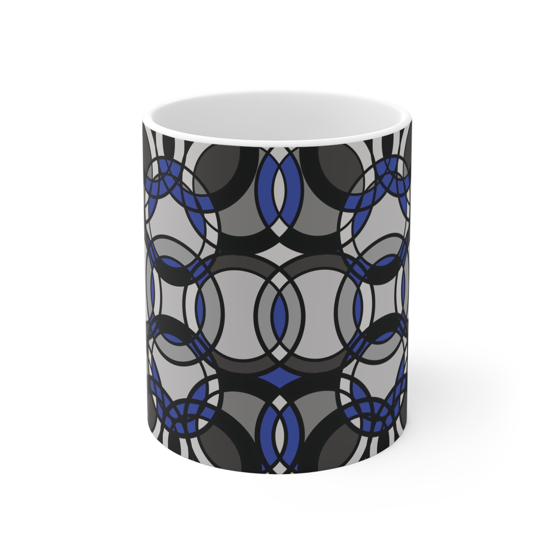11 oz. ceramic mug with comfortable C-shaped handle. Mug is lead and BPA-free. Microwave and dishwasher safe.