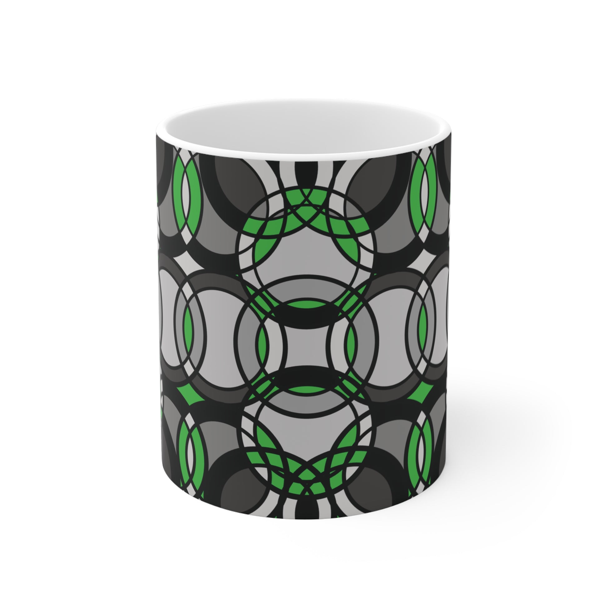 11 oz. ceramic mug with comfortable C-shaped handle. Mug is lead and BPA-free. Microwave and dishwasher safe.