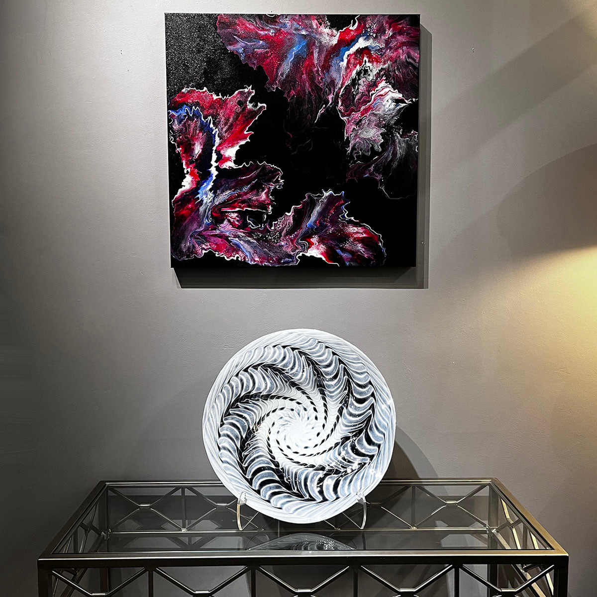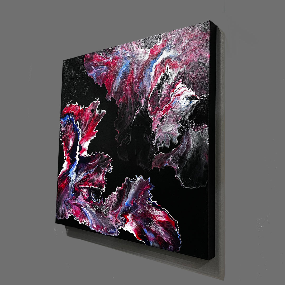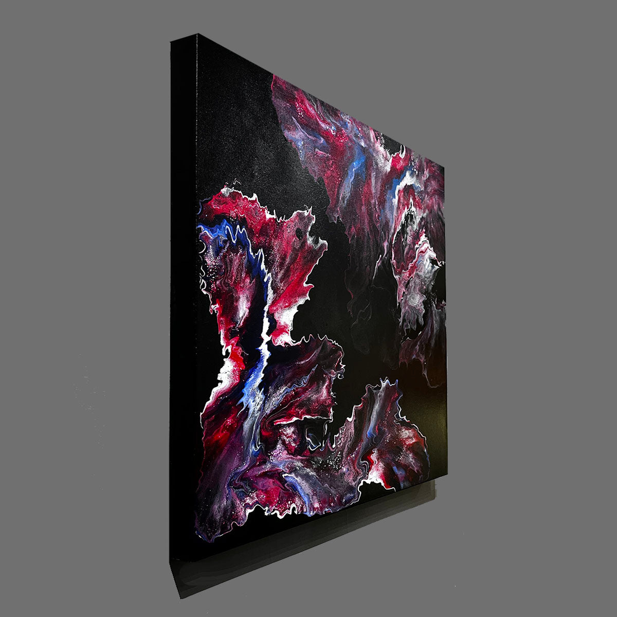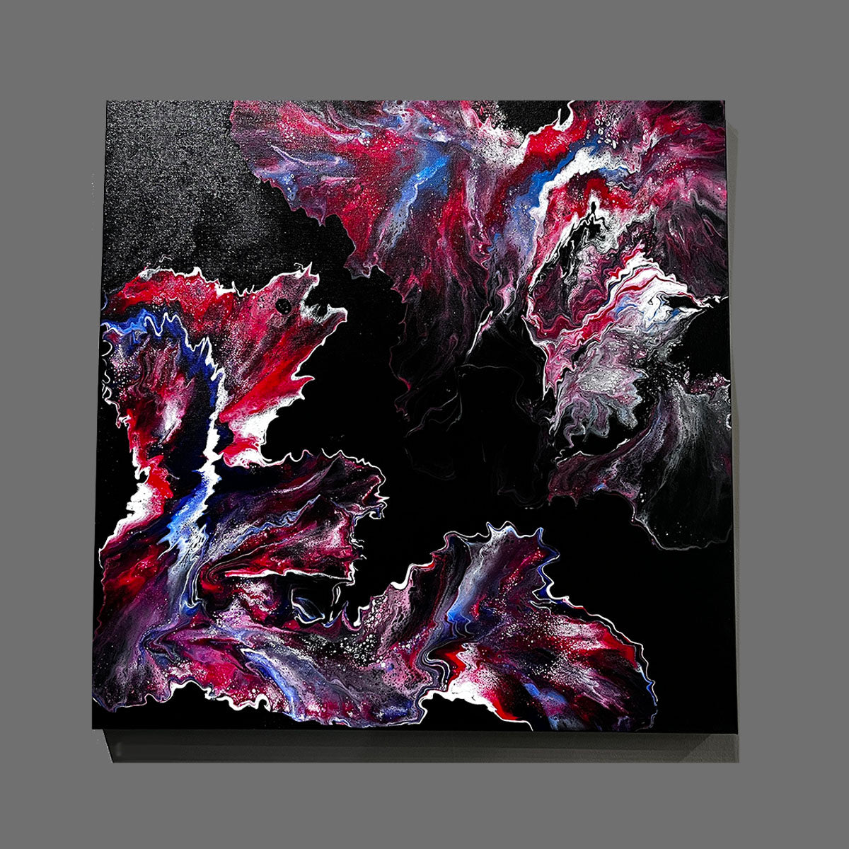 A remarkable focal point for any indoor space. Spiraling tones of reds, blues, and white move gracefully on the canvas, reminiscent of capturing snapshots from the universe. The more you gaze, the more you will appreciate. Signed, painted edges, wired and ready to hang. Can rewire to hang from any side for a different view.