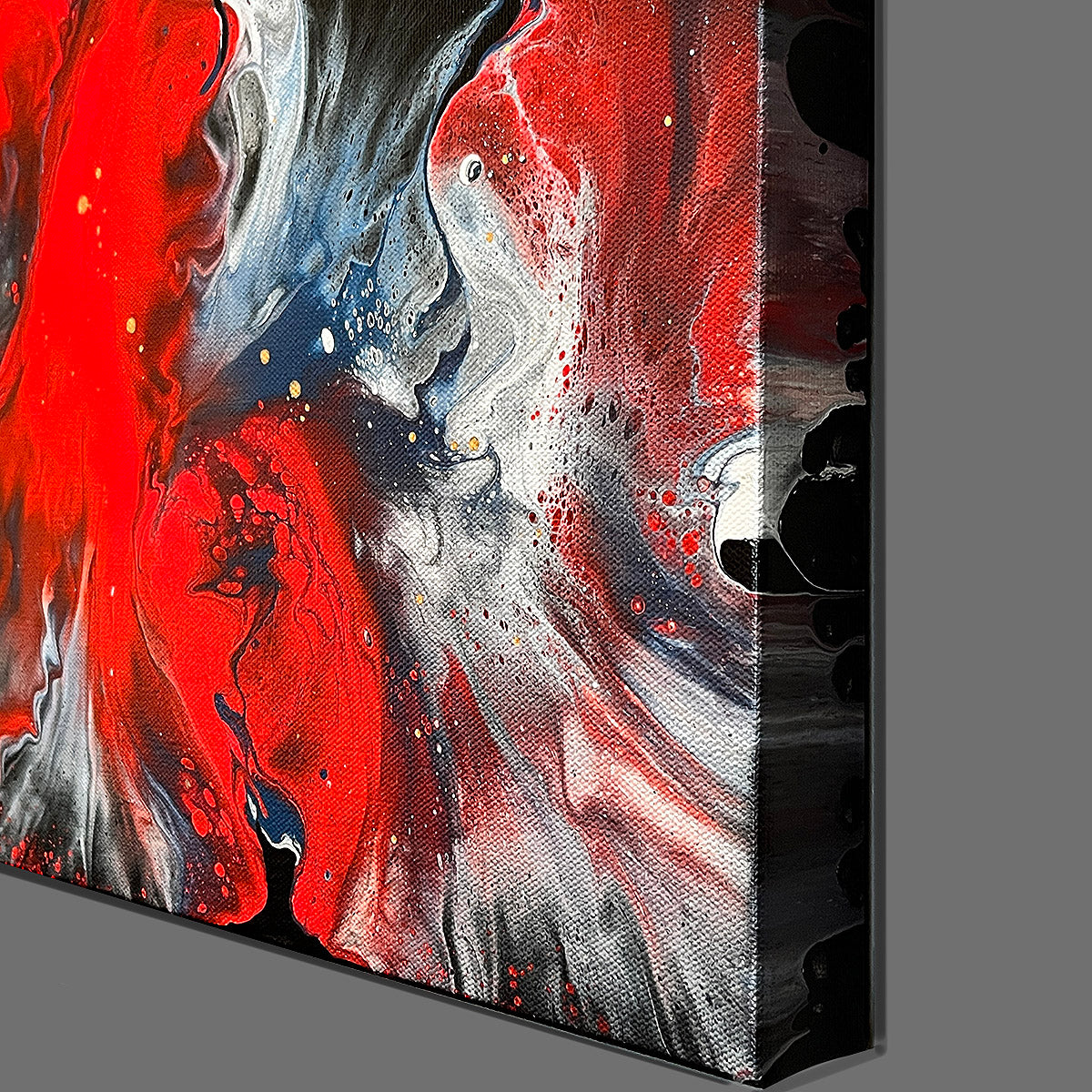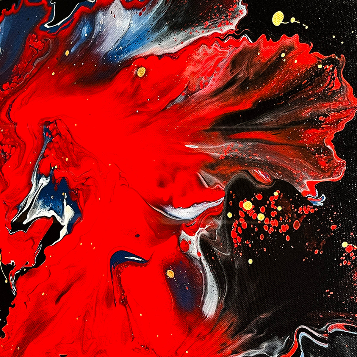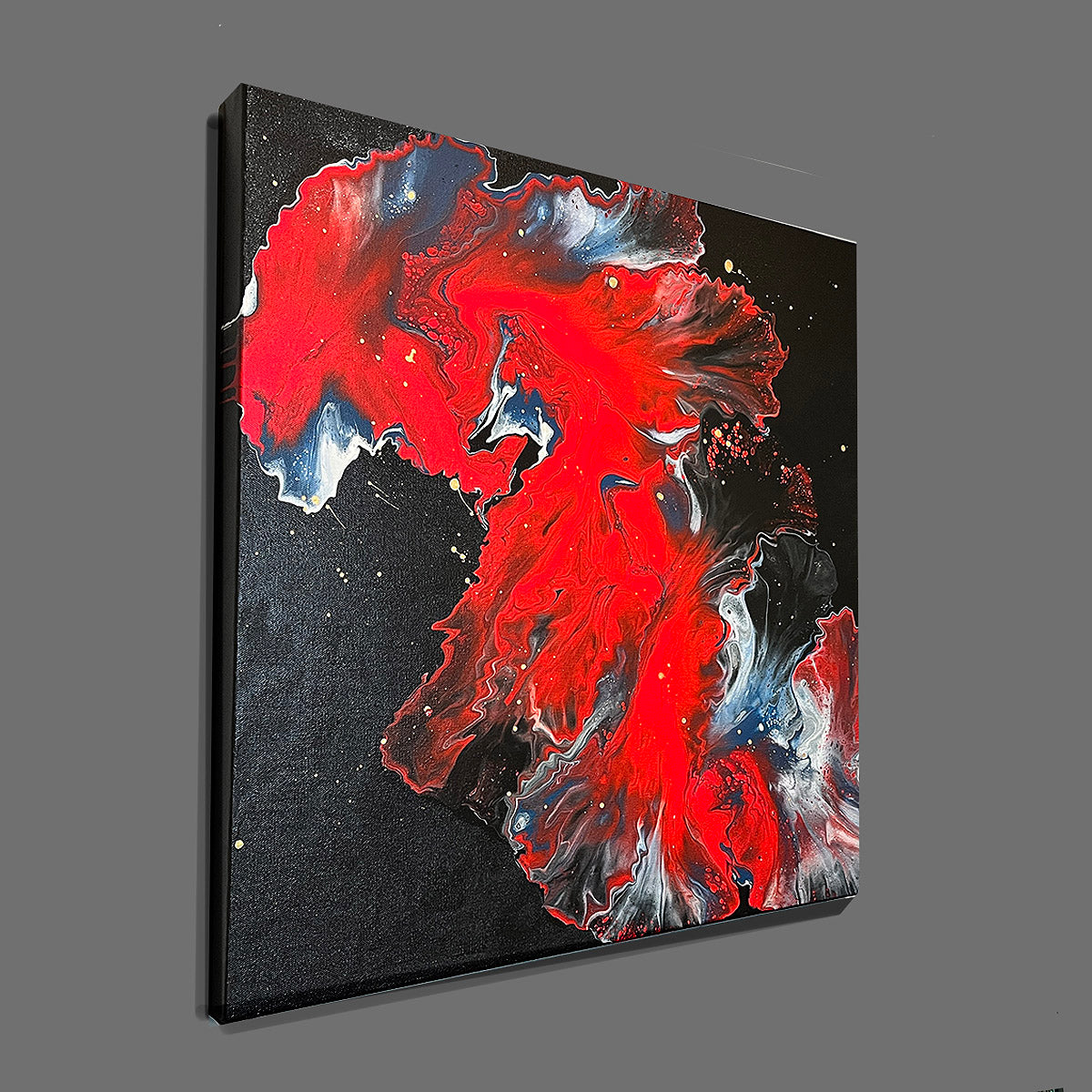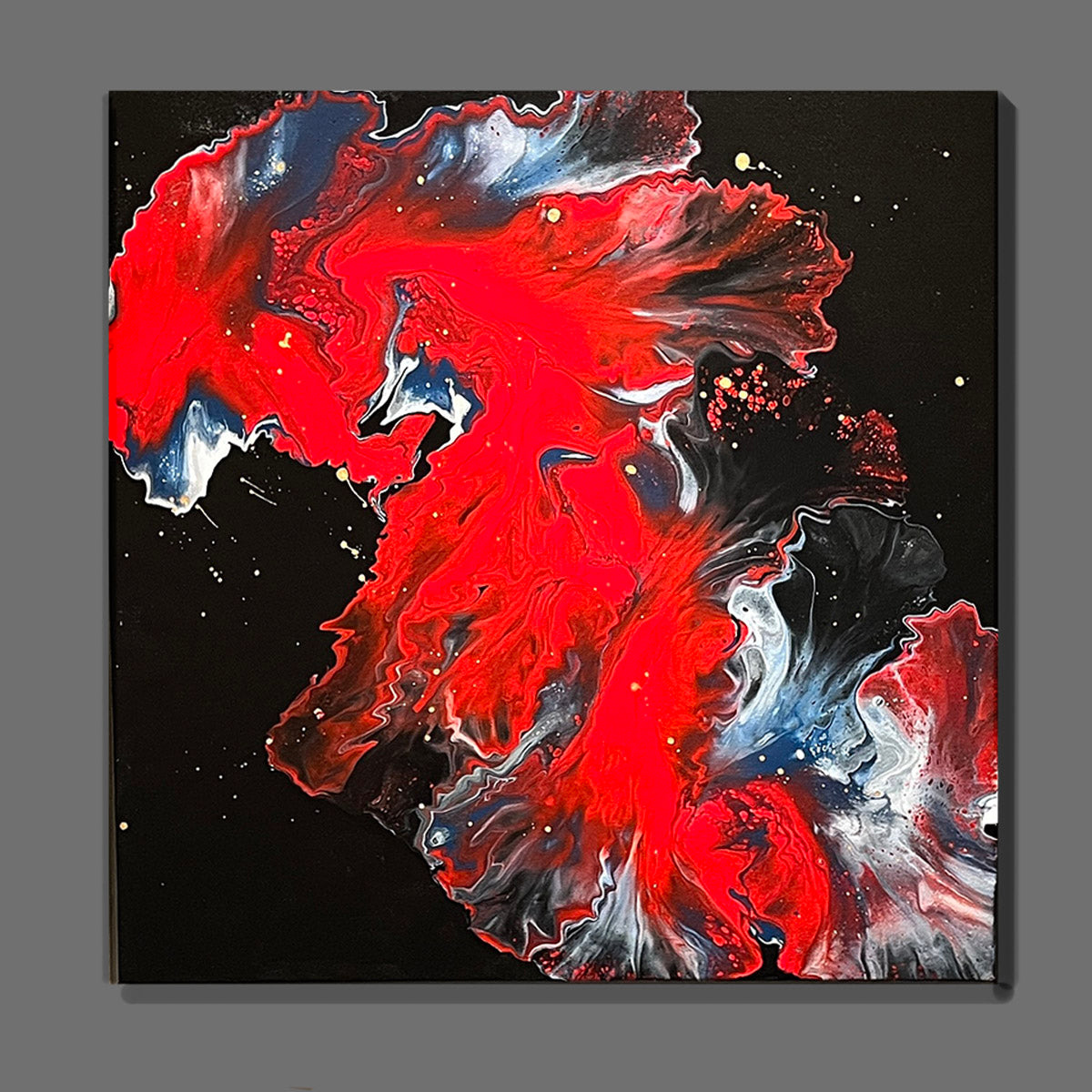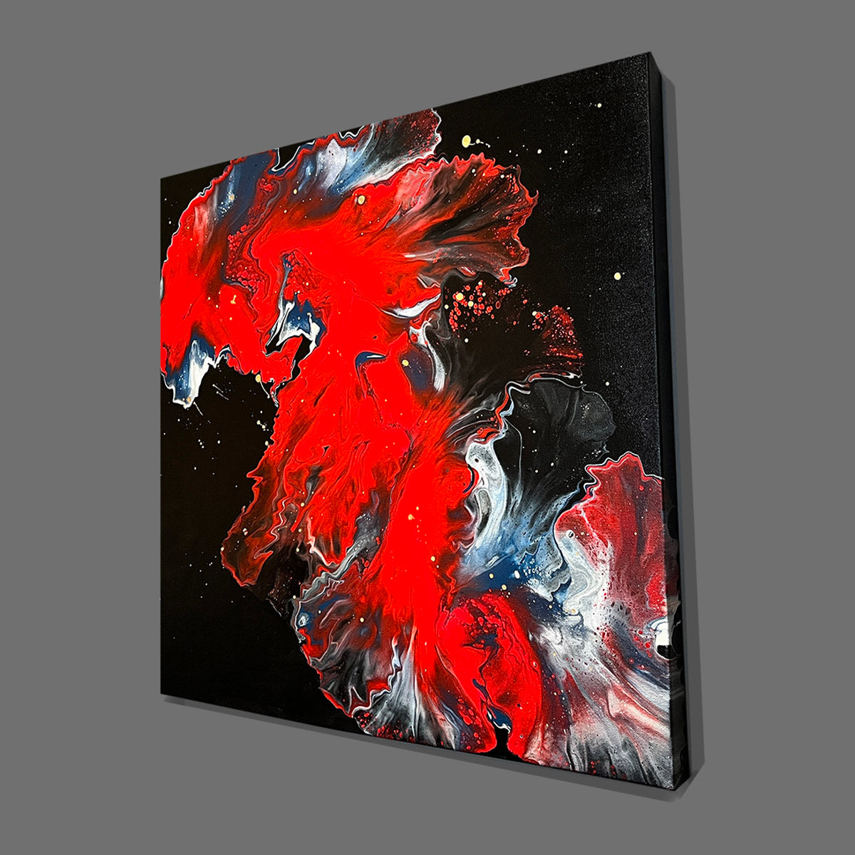 Vibrant reds highlighted with white dance across a black sky with warm blue pops adding depth to the cosmic feel of this painting. Speckled with gold paint that twinkles in the light like stars in the night sky. Signed, painted edges, wired and ready to hang. Can rewire to hang from any side for a different view.