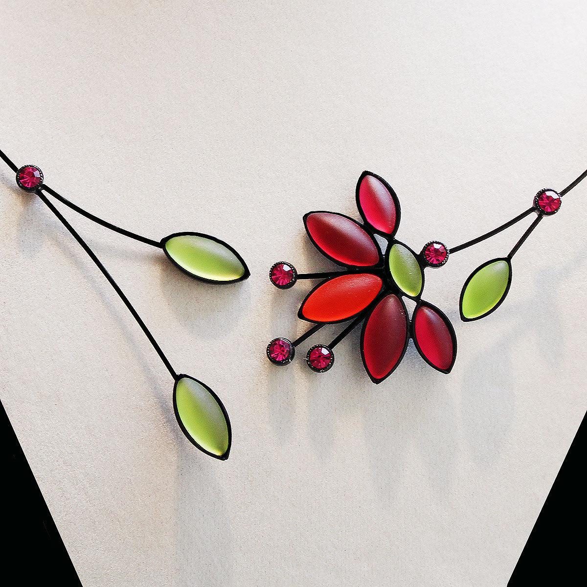 An eye catching Mimosa flower pattern on this open wire necklace will make a statement with any outfit. Certain colors will have color shifting beads as well which can be seen in the alternate images of each necklace. A unique look that is lightweight and comfortable to wear. Nickel free and hypoallergenic.