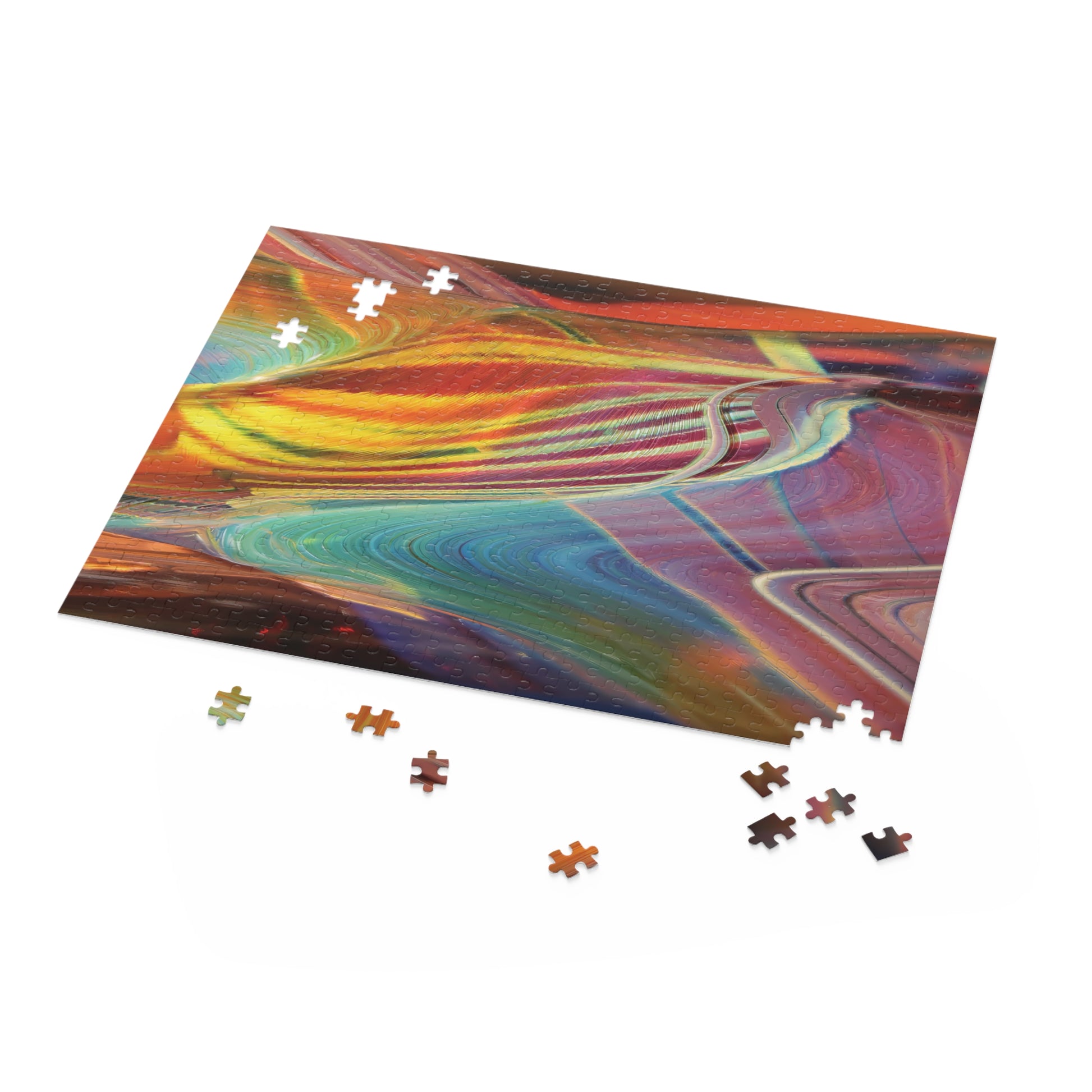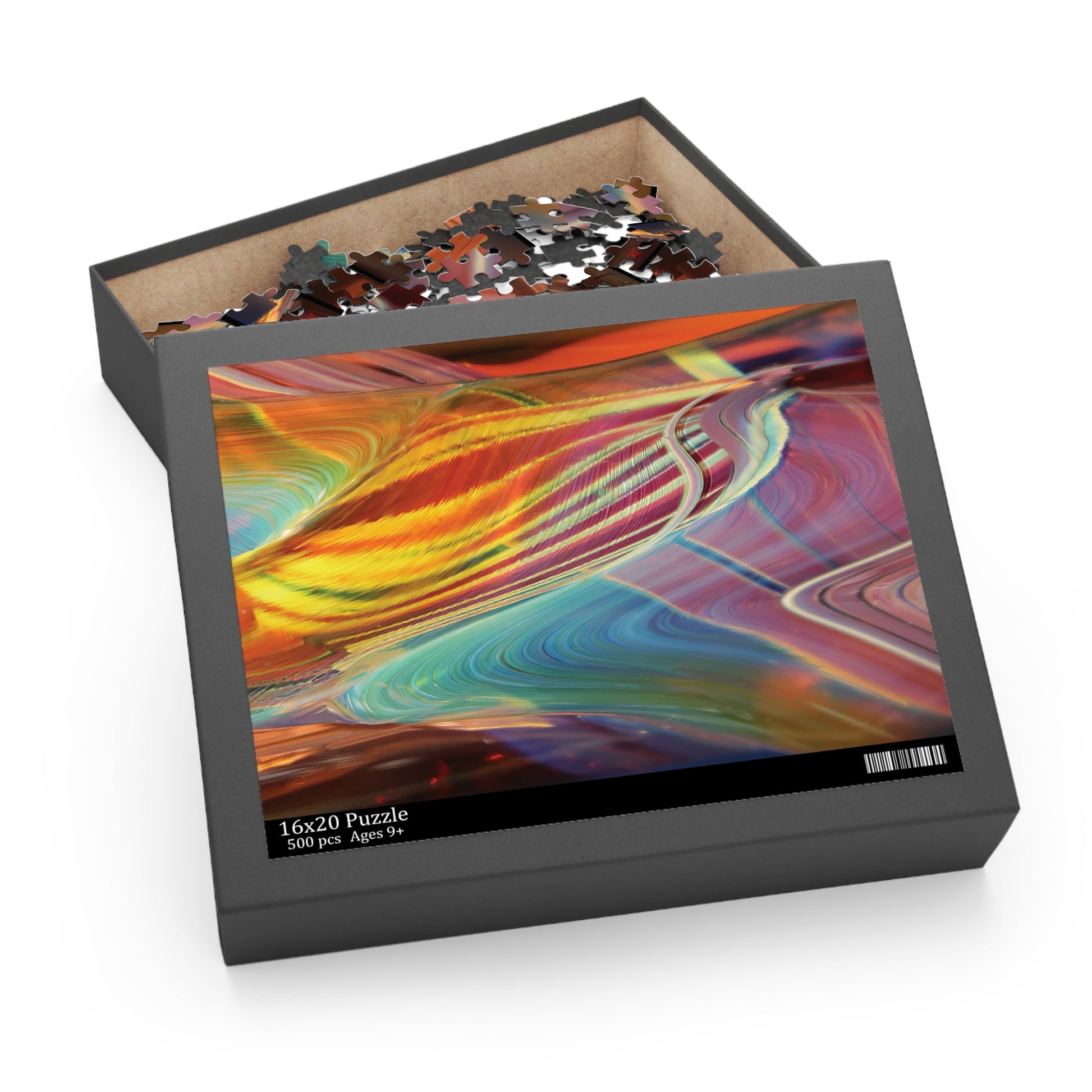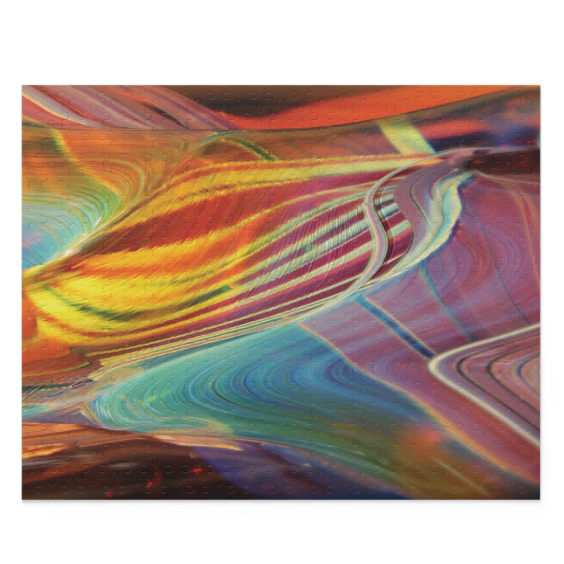 Test your puzzle skills with this original image of undulating colors and patterns. An art glass detail frozen in puzzle form to enjoy any time of year.