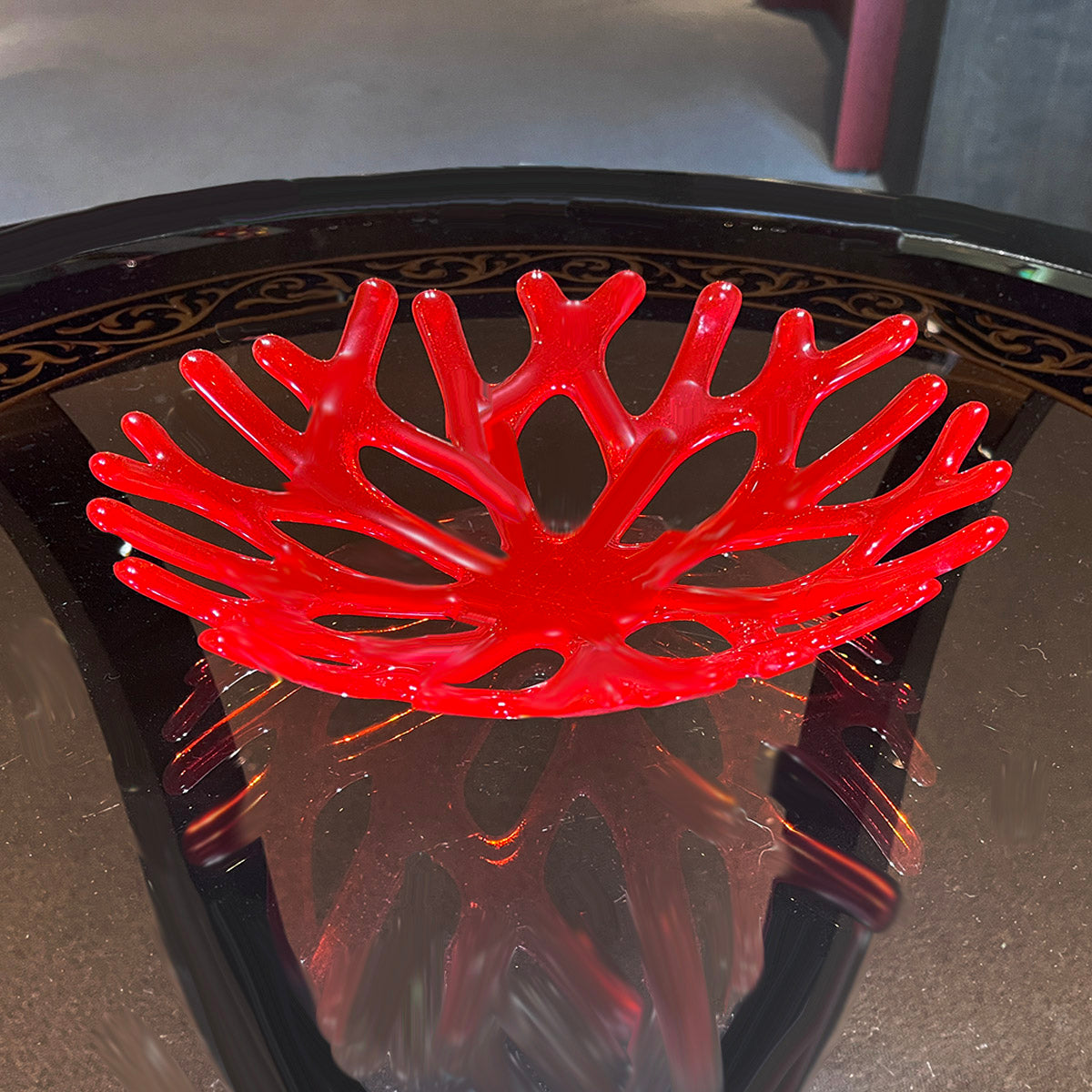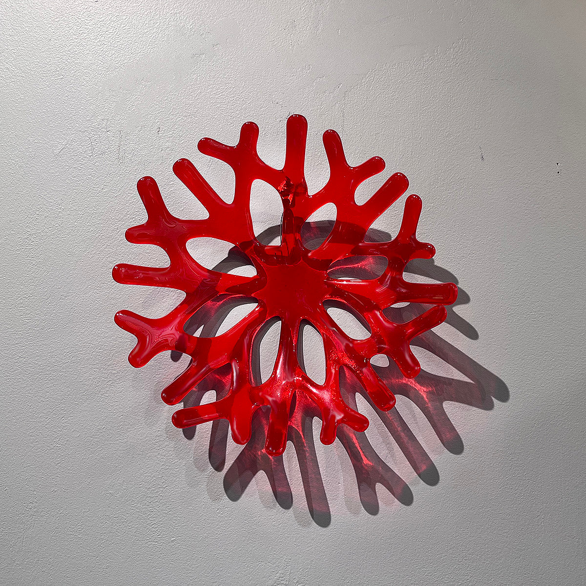 Petite piece that is easy to fit into small spaces adding that perfect pop of color. A bright transparent Red that can easily hang on a wall or sit on a table. They create wonderful colored shadows around them. A unique organic shape reminiscent of coral, these pieces make a statement alone, or as an installation.
