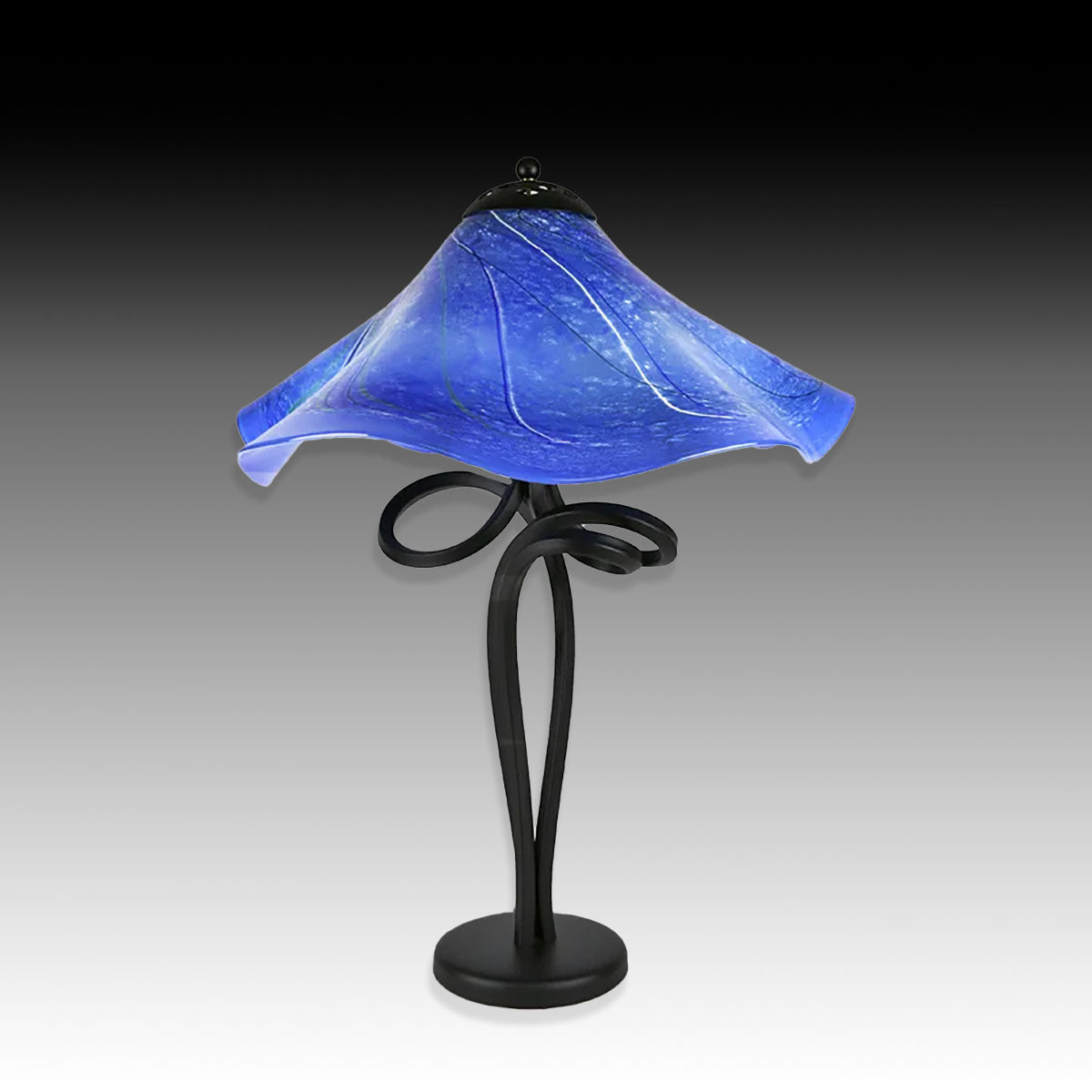 Table lamp with hand blown shade and hand bent sculptural steel base with a black powder coated finish. Shade is on a swivel mount so you can adjust the shade as needed. Base has two standard sockets with pull chains. An in-line dimmer switch on cord. All parts comply with all applicable UL standards. Each lamp is signed and dated.