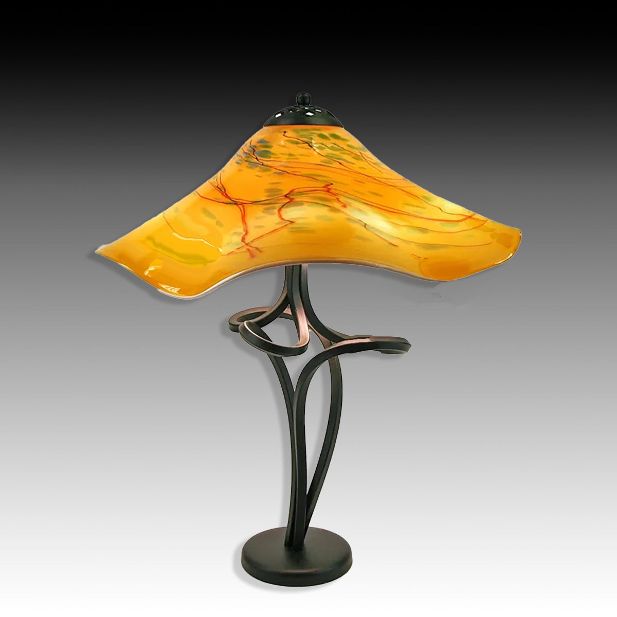 Handblown glass shade in a vibrant yellow atop a hand bent steel body twisted into a unique shape and powder coated black. Shade is on a swivel mount so you can adjust the lighting to where you're seated. An in-line dimmer switch on the cord, varies the light from a soft glow to full strength. All parts comply with all applicable UL standards.
