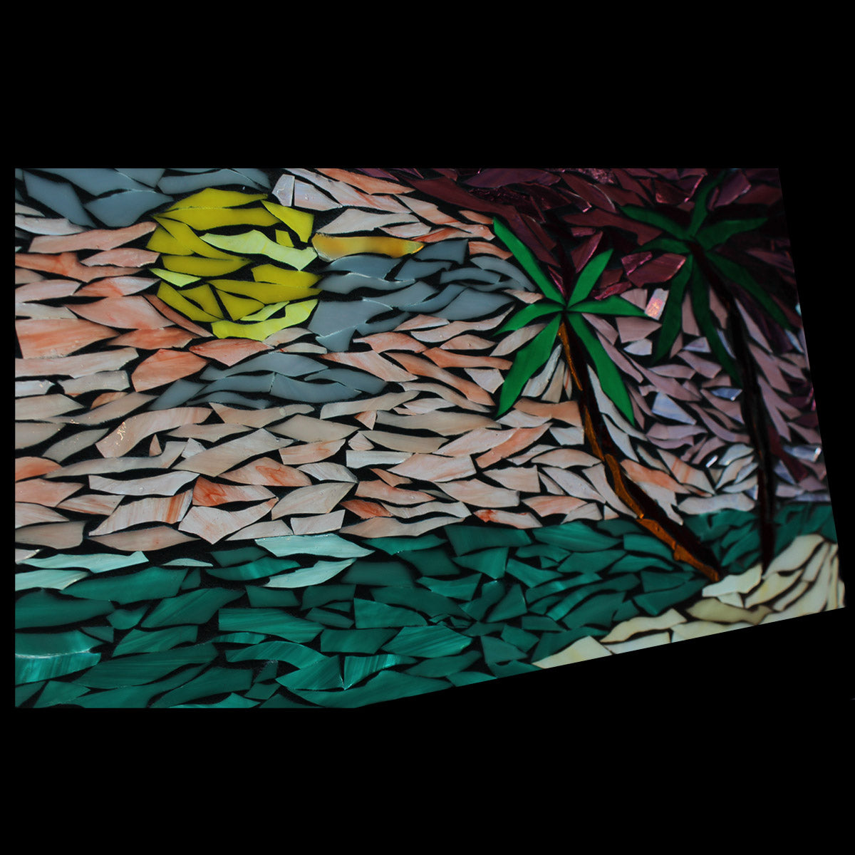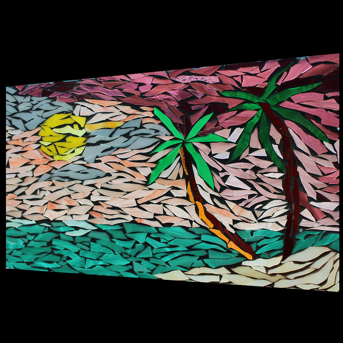 A subdued color palette featuring peaches, cranberry and plum glass in the sky with a Caribbean green ocean. Two palm trees sitting on an island that tie it all together. Iridescent amber glass highlights on one tree trunk add more interest as you view it from different angles.