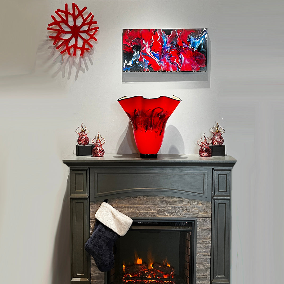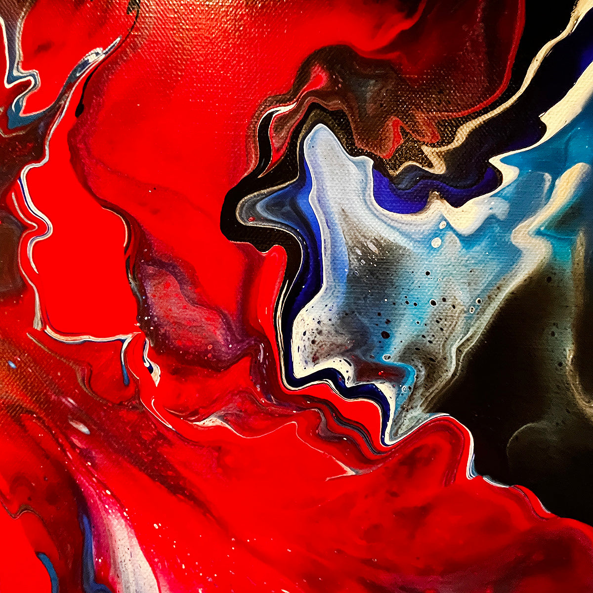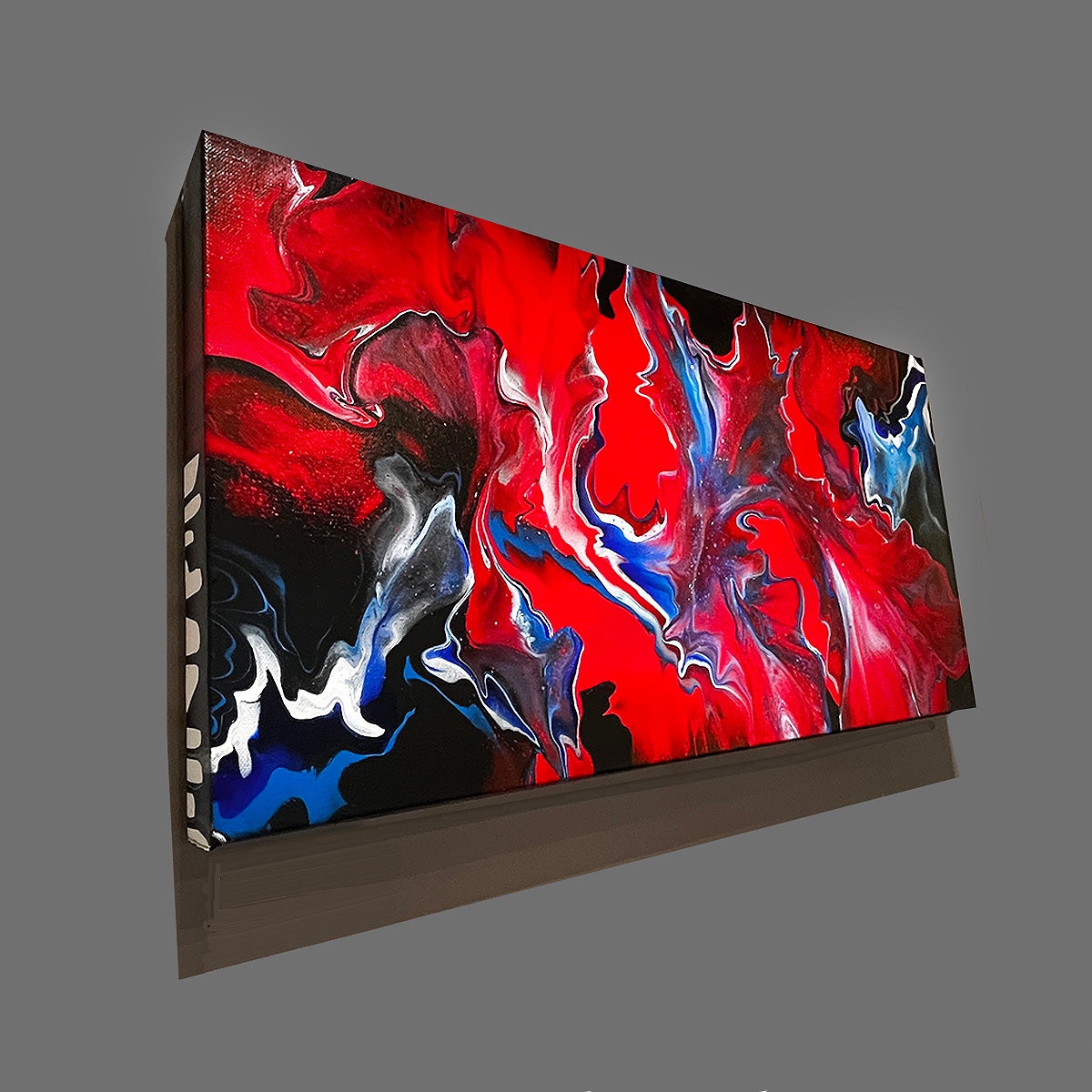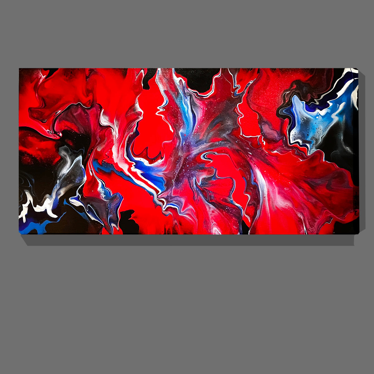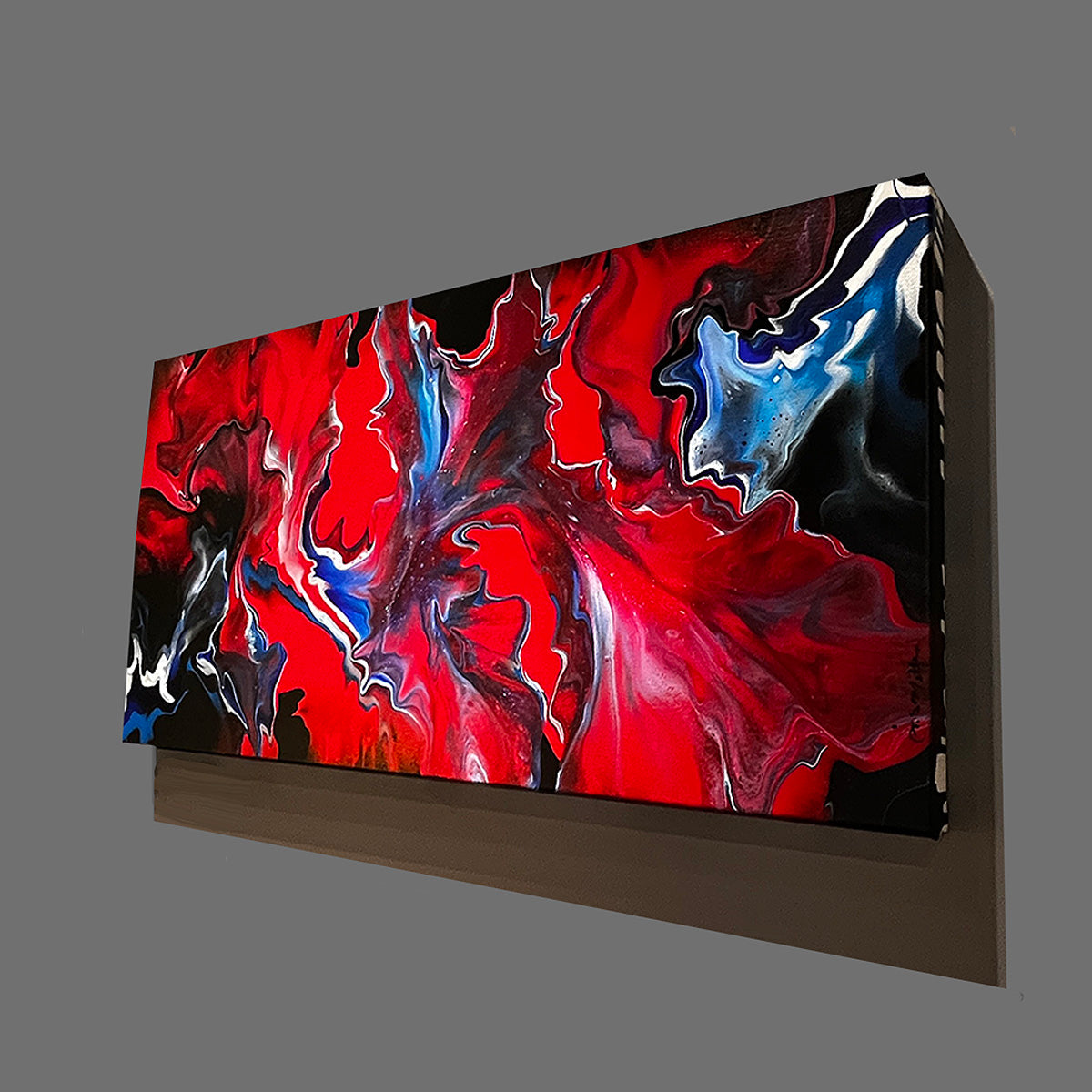 The vibrant reds of Super Nova are beautifully enhanced by cosmic blues, creating a mesmerizing explosion of color that takes your eyes on a cosmic journey across the canvas. A one of a kind original guaranteed to enhance any interior. Signed, painted edges, wired and ready to hang. Can rewire to hang vertically as well.