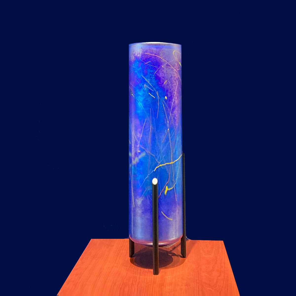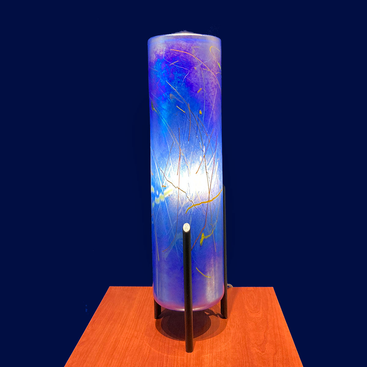 Handblown glass cylinder that sits in a custom metal stand creating a unique accent uplight for any room. Vibrant iridescent finish radiates when the lamp is turned off showing a rainbow of colors as you change your viewing angle. A sculptural piece as an accent lamp that makes a perfect finishing touch to any interior.